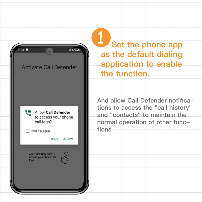 1️⃣ Set the phone app as the default dialing application to enable the function. And allow Call Defender notifications to access the "call history" and "contacts" to maintain the normal operation of other functions